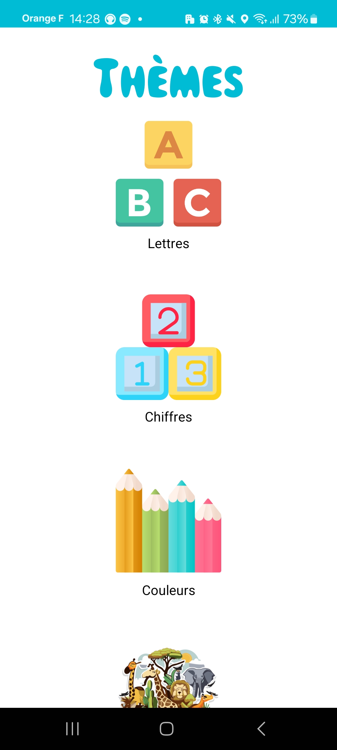 The application is divided into several categories: animals, colors, shapes, numbers, and letters. Each category has several mini-games that allow children to learn while having fun.